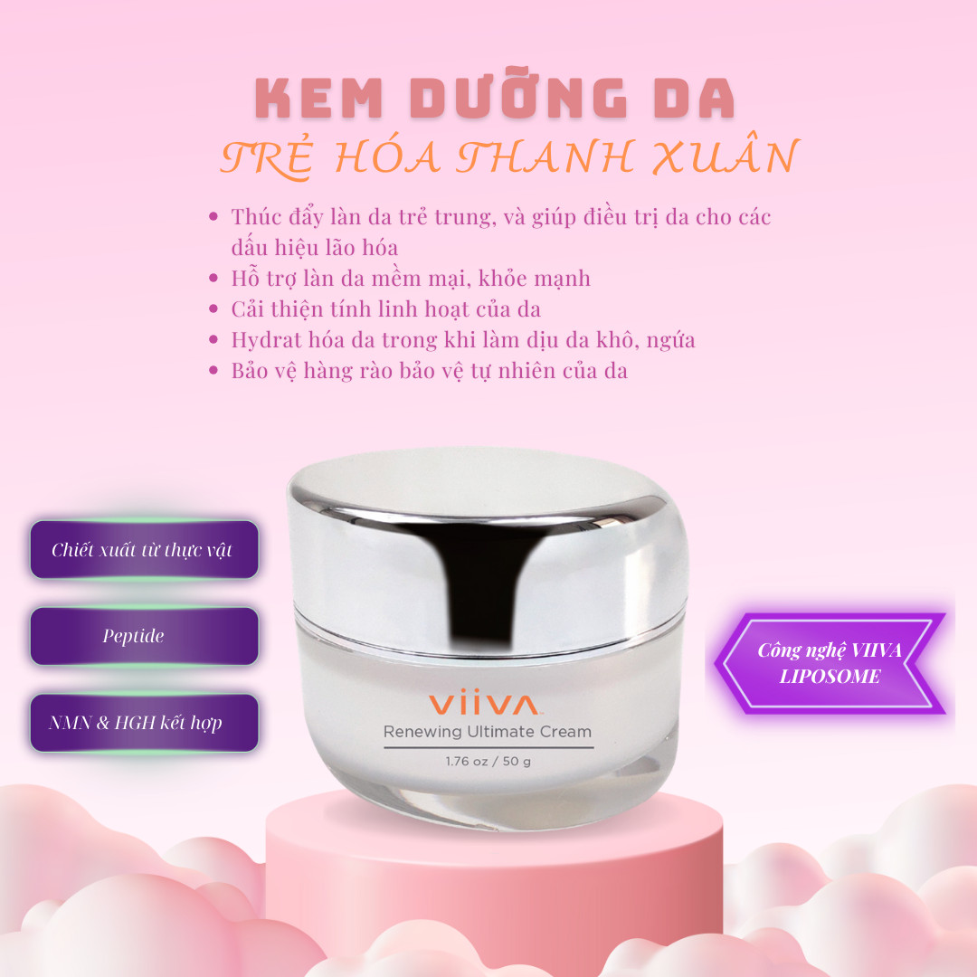 Kem dưỡng trắng da huỷ nám tái tạo tối ưu - VIIVA Renewing Ultimate Cream, được làm giàu với peptide và nhiều chiết xuất thực vật, được điều chế để phục hồi năng lượng cho da, tăng độ đàn hồi cho da và nuôi dưỡng làn da cả ngày lẫn đêm.